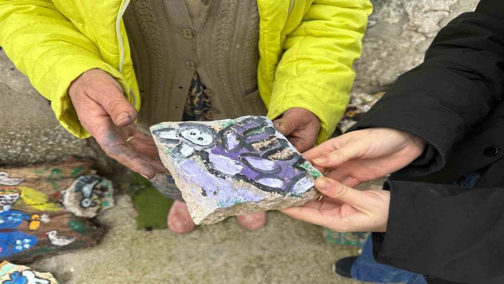 Kartonlara, ağaç ile taş parçalarına ve kağıtlara resim çiziyor