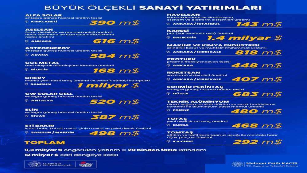 Sanayi ve Teknoloji Bakanı Mehmet Fatih Kacır, yıllık cari dengeye 12 milyar dolarlık katkı sağlayacak olan büyük ölçekli sanayi yatırımlarını paylaştı.Sanayi ve Teknoloji Bakanı Mehmet Fatih Kacır, 9,3 milyar dolarlık öngörülen yatırım tutarı ile 20 binden fazla istihdam ve yıllık cari dengeye 12 milyar dolarlık katkı sağlayacak olan Büyük Ölçekli Sanayi yatırımlarının ayrıntılarını paylaştı.Geçtiğimiz günlerde Cumhurbaşkanı Recep Tayyip Erdoğan tarafından açıklanan yatırımların ayrıntılarını sosyal medya hesabından paylaşan Bakan Kacır, şu ifadeleri kullandı: "Edirne’den Samsun’a, Bilecik’ten Sivas’a 15 şehrimizde hayata geçecek büyük ölçekli sanayi yatırımları Türkiye’ye güç katacak. Güneş enerjisi teknolojilerinden yeni nesil araçlara, savunma sanayiinden sağlık teknolojilerine, ana metalden petrokimyaya Türkiye, yenilikçi teknolojilerde ve hammadde arz güvenliğinde yükselişini sürdürecek. 9,3 milyar dolar yatırımla, 20 binden fazla istihdam sağlanacak, cari dengemize yıllık 12 milyar dolar katkı sunulacak" İfadelerini kullandı.Bakan Kacır’ın paylaşımında Chery markasının Samsun’da gerçekleştireceği 1 milyar dolarlık Yeni Nesil Araç Üretimi ve Tedarik Sanayi Kampüsü de yer aldı.Kacır’ın alfabetik olarak paylaştığı listede yer alan firmalar, yatırım konuları ve tutarları ise şu şekilde:Alfa Solar Enerji: 390 milyon dolar - KırklareliYatırım: Entegre güneş hücresi üretim tesisiAselsan: 616 milyon dolar - AnkaraYatırım: Foton dedektör ve nanoteknoloji üretimi-Hava savunma ve füze savunma sistemi-Radar üretimiAstronergy Yüksek Teknoloji: 584 milyon dolar - AdanaYatırım: Entegre güneş hücresi üretim tesisiCCE Metal ve Kimya Ticaret: 168 milyon dolar - BilecikYatırım: Özel alaşımlı alüminyum formları üretimiChery: 1 milyar dolar - SamsunYatırım: Marka Yeni nesil araç üretim ve tedarik sanayi kampüsüCW Solar Cell Enerji: 520 milyon dolar - AntalyaYatırım: Entegre güneş hücresi üretim tesisiElin Yarı İletken Teknolojileri: 387 milyon dolar - SivasYatırım: Entegre üneş hücresi üretim tesisiEti Bakır: 498 milyon dolar - Samsun-MardinYatırım: Katot Bakır, Kobalt Metal, Çinko Metal ve Pelet Demir ÜretimiHavelsan: 143 milyon dolar - Ankara - İstanbulYatırım: Komuta kontrol ile simülasyon, otonom ve platform sistemleri üretimiKaresi Polyester ve Petrokimya Sanayi: 1.4 milyar dolar - BalıkesirYatırım: PTA (saf tereftalik asit) üretimiMakine ve Kimya Endüstrisi A.Ş. (MKE): 818 milyon dolar - Ankara - KırıkkaleYatırım: Silindirik barut ve muhtelif mühimmat üretimiProturk İlaç: 448 milyon dolar - AnkaraYatırım: Plazma Fraksiyonasyon TesisiRoketsan: 407 milyon dolar - Ankara-KırıkkaleYatırım: Savunma sistemleri üretimiSchmid Pekintaş Güneş Enerji Sistemleri: 683 milyon dolar - DüzceYatırım: Entegre güneş hücresi üretim tesisiTeknik Alüminyum Sanayi: 480 milyon dolar - EdirneYatırım: Direkt soğutmalı slab döküm ve sıcak haddeleme yöntemi ile alüminyum yassı mamul üretimiTofaş: 468 milyon dolar - BursaYatırım: Yeni Nesil Ticari Araç ÜretimiTomtaş Havacılık ve Teknoloji: 292 milyon dolar - KayseriYatırım: Eğitim ve hafif kara taarruz uçağı ile montaja hazır uçak parçası üretimi