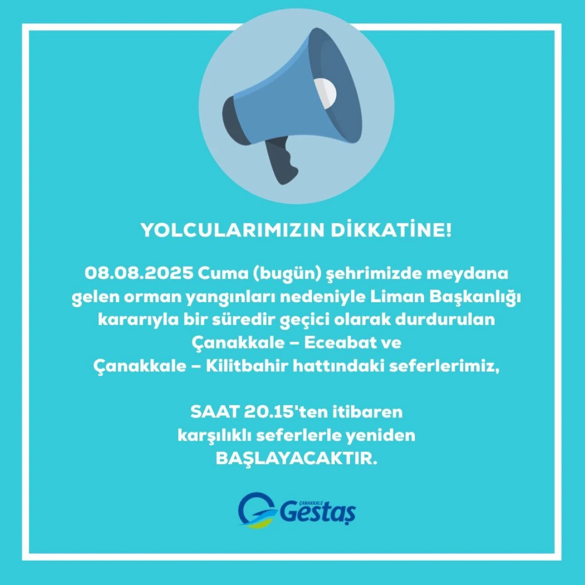 GESTAŞ'tan yapılan açıklamada, 08.08.2025 Cuma (Bugün) şehrimizde meydana gelen orman yangınları nedeniyle Liman Başkanlığı kararıyla bir süredir geçici olarak durdurulan Çanakkale - Eceabat ve Çanakkale - Kilitbahir hattındaki seferlerimiz saat 20:15'den itibaren yeniden başlayacaktır" denildi.
