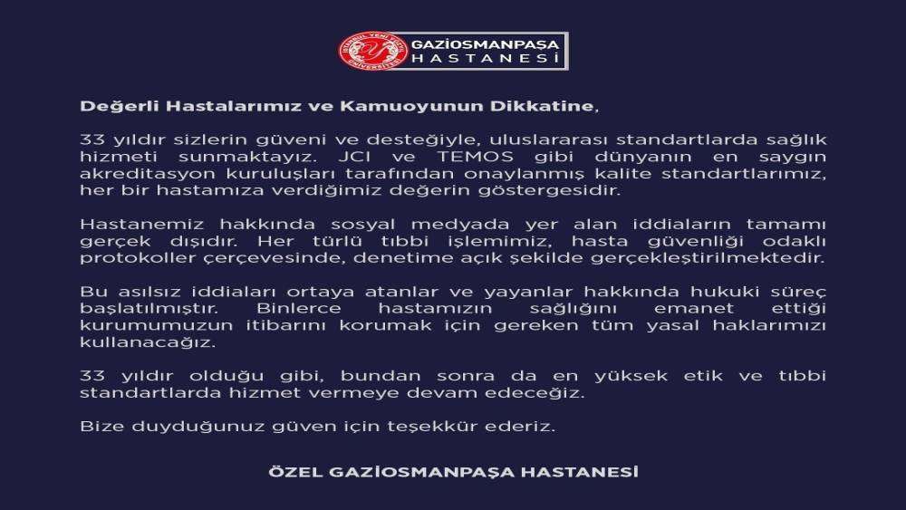 Öte yandan, iddialara karşı hastanenin sosyal medya hesabından yapılan açıklamada, “33 yıldır sizlerin güveni ve desteğiyle, uluslararası standartlarda sağlık hizmeti sunmaktayız. JCI ve TEMOS gibi dünyanın en saygın akreditasyon kuruluşları tarafından onaylanmış kalite standartlarımız, her bir hastamıza verdiğimiz değerin göstergesidir. Hastanemiz hakkında sosyal medyada yer alan iddiaların tamamı gerçek dışıdır. Her türlü tıbbi işlemimiz, hasta güvenliği odaklı protokoller çerçevesinde, denetime açık şekilde gerçekleştirilmektedir. Bu asılsız iddiaları ortaya atanlar ve yayanlar hakkında hukuki süreç başlatılmıştır. Binlerce hastamızın sağlığını emanet ettiği kurumumuzun itibarını korumak için gereken tüm yasal haklarımızı kullanacağız. 33 yıldır olduğu gibi, bundan sonra da en yüksek etik ve tıbbi standartlarda hizmet vermeye devam edeceğiz. Bize duyduğunuz güven için teşekkür ederiz” ifadelerine yer verildi.