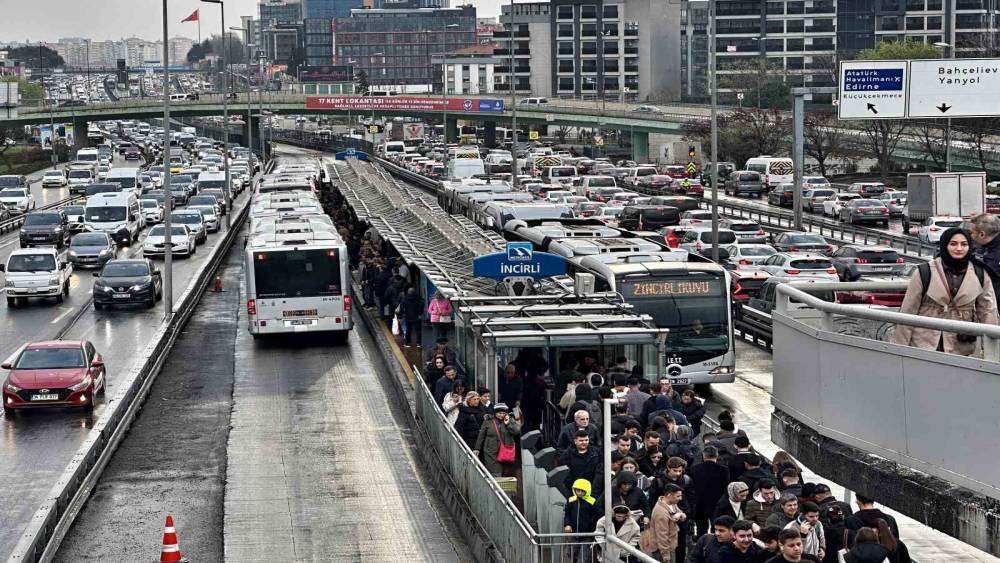 İstanbul’da son çalışma gününde yer yer etkili olan yağış, trafik yoğunluğuna neden oldu. Yaşanan yoğunluk Yenibosna E-5 mevkiinden görüntülendi.