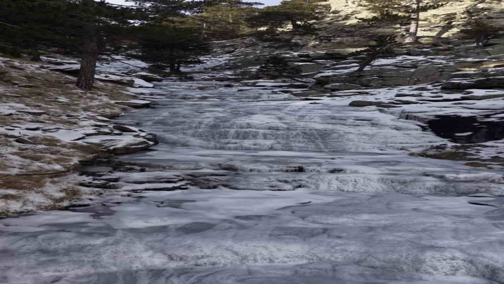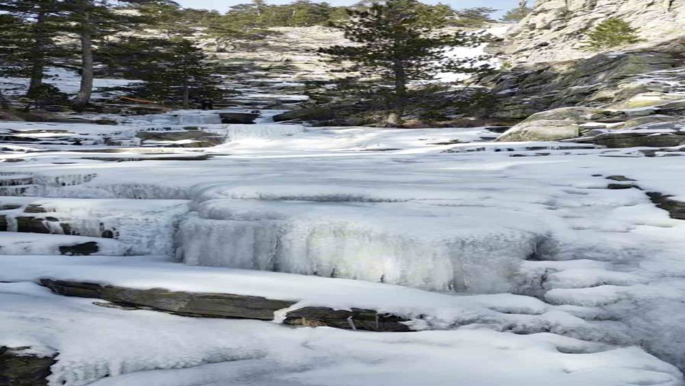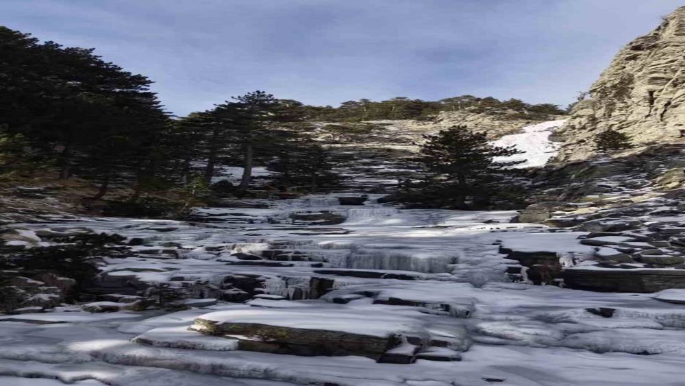 Kaz Dağları’nda görsel şölen; -12 derecede donan şelale büyüledi