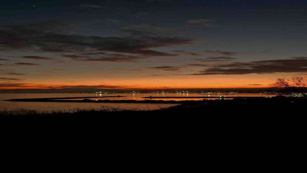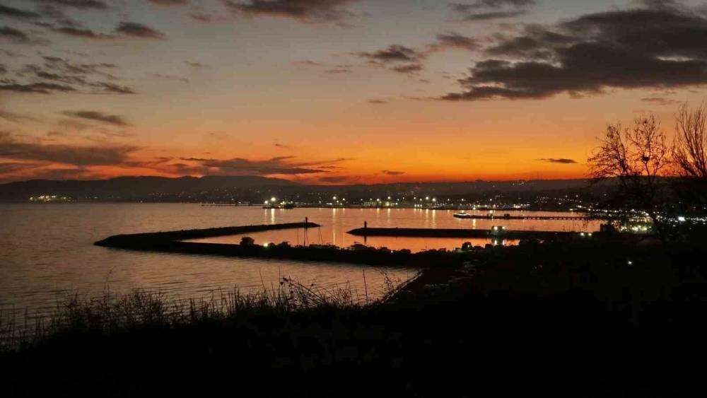 Tekirdağ’ın Süleymanpaşa ilçesinde akşam saatlerinde güneşin batışıyla birlikte gökyüzü kızıl ve turuncunun en güzel tonlarına büründü. Günün son ışıkları denizin yüzeyine yansıyınca ortaya eşsiz bir manzara çıktı. Tekirdağ’ın en güzel sahillerinden olan Süleymanpaşa sahilinde yaşanan manzaraa görenleri kendine hayran bıraktı. Balıkçıların olduğu bölgede kimi vakandaşların da sahilde yürüyüş yaptığı görüldü.