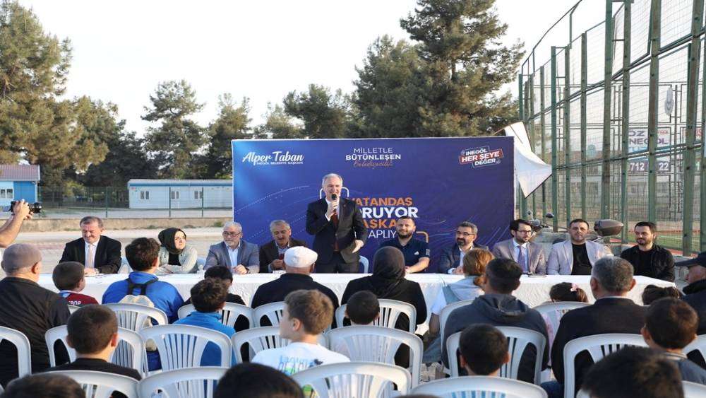 İnegöl Belediye Başkanı Alper Taban, mahalle buluşmaları kapsamında ilk toplantısını Fatih ve Cumhuriyet Mahallelerinin ortak noktası olan Alanyurt Sentetik Çim Saha bahçesinde gerçekleştirdi.